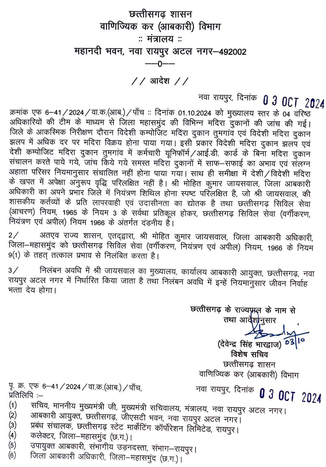 3 अक्टूबर 2024/ महासमुंद/ जिला आबकारी अधिकारी मोहित कुमार जायसवाल को निलंबित कर दिया गया । एक अक्टूबर को आबकारी की सचिव आर संगीता ने जिले मे चार टीम को के माध्यम से शराब दुकानो का निरीक्षण कराया था , जिसमे ओवर रेट की शिकायत , ब्रांड शराब की उपलब्धता नही होना , अवैध शराब बिक्री का न रुकना , कर्मचारियों के द्वारा यूनिफॉर्म न पहनना एवं पिछले साल की तुलना मे शराब की बिक्री कम होने के कारण निलंबन का प्रस्ताव भेजने की जानकारी दी थी ।